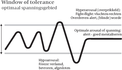 Om goed in contact met je eigen gevoelens en gedachten én die van de ander te kunnen zijn, en om goed voeling te houden en te kunnen reflecteren over de relatie is er een optimaal niveau van spanning of arousal nodig. De window of tolerance (Siegel, 1999) is een helpend model bij mentaliseren. Het is een visueel handvat dat ik vaak teken in een partnerrelatietherapie of systeemtherapie (zie figuur 1).