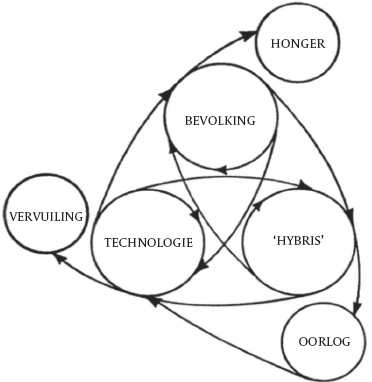 Gregory Bateson (1972, 1979) liet een grimmige waarschuwing achter voor de mensheid, namelijk dat we onze manier van denken dienen te veranderen of dat we anders zullen uitsterven. Volgens Bateson zouden de volgende drie factoren ons naar een catastrofe leiden: de bevolkingsgroei, onze afhankelijkheid van een zich steeds verder ontwikkelende technologie en de manier waarop we denken. Deze drie factoren werken op elkaar in. Bevolkingstoename lokt verdere technologische ontwikkeling uit. Bovendien maakt verdere technologische evolutie bevolkingsgroei mee mogelijk. Dit leidt dan weer tot een soort arrogantie of overmoed (hybris) tegenover onze natuurlijke omgeving. We zoeken naar oplossingen voor problemen zonder rekening te houden met de bredere systemische implicaties. Het is vooral onze dualistische, lineaire en doelgerichte manier van denken die ertoe leidt dat we de ecologie waarvan we deel uitmaken vernietigen. Non-dualistisch en circulair denken betekent denken in gehelen, waar alles met elkaar verbonden is. Oorlog, hongersnood en vervuiling zijn existentiële uitdagingen die niet los gezien kunnen worden van elkaar en moeten breed-systemisch worden onderzocht en aangepakt. Deze uitdagingen maken deel uit van een web en zijn zowel oorzaak als gevolg (zie figuur 1). Wij zijn de natuur, samen met de planeet en haar inwoners. Het wezen dat het wint van zijn omgeving, vernietigt zichzelf, aldus Bateson.