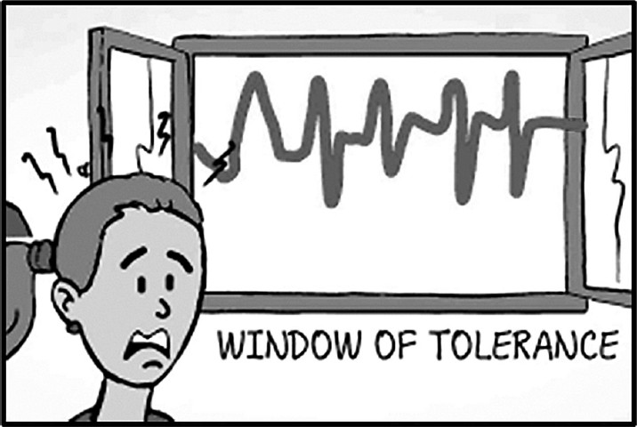 Bij FITT en Kinderen uit de Knel vinden altijd systeemgesprekken plaats. Tussen ouders, tussen ouders en jongere of met het hele gezin. Bij het herstellen van de relationele veiligheid in gezinnen na huiselijk geweld gaat het om systemisch werken binnen de Window of Tolerance (Siegel, 2020). Bij de individuele traumabehandelingen leren de gezinsleden hoe ze hun emoties kunnen reguleren, wat hun triggers zijn en hoe ze ervoor kunnen zorgen dat ze niet te hoog of te laag in hun spanning komen, ofwel hoe ze in hun ‘raampje’ blijven. Dat wil zeggen op het stressniveau waarop ze nog naar elkaar kunnen luisteren, zich in elkaar kunnen verplaatsen en empathie kunnen voelen. Voor iedereen is dat ‘raampje’ verschillend en de gezinsleden zullen door verschillende interacties met elkaar getriggerd worden. Dit leggen we aan de gezinsleden uit met behulp van de animatie over de Window of Tolerance (Augeo Foundation, 2022; zie ook figuur 1) en we laten aansluitend de animatie Geweld in het gezin – basispatronen (Academische Werkplaats Kindermishandeling, z.d.) zien. De animatie geeft uitleg over destructieve communicatiepatronen, kwetsbaarheden en de kwetsbaarheidscyclus (Scheinkman, 2017).