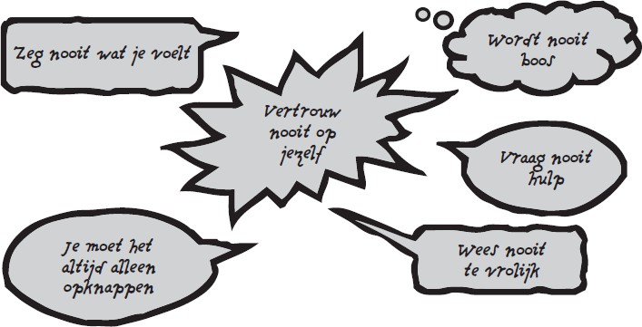 Overlevingsstrategieën zijn overtuigingen en manieren om kwetsuren te beschermen of ermee om te gaan (zie figuur 3). Deze strategieën om te overleven vormden ooit een eigen waarheid, maar passen niet meer in de actuele situatie. In het heden worden ze niet meer getoetst op hun waarheid.